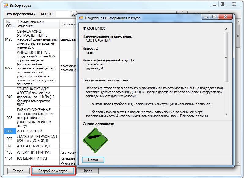 При отображении на экране в результате поиска одного или нескольких грузов, в нижней части экрана станет активной кнопка «Подробнее о грузе». В информационном окне, которое открывается после нажатия на эту кнопку, отобразится подробная информация об опасном грузе, а также специальные положения, касающиеся его классификации. Эта информация может оказаться полезной для правильного выбора опасного груза.