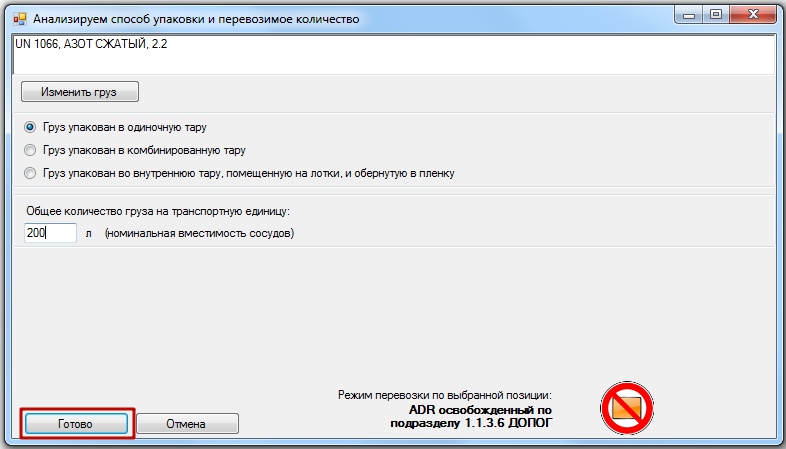 После того, как Вы определились с выбором опасного груза, щелкните по нему левой кнопкой мыши и нажмите кнопку «Готово» в нижней части экрана.