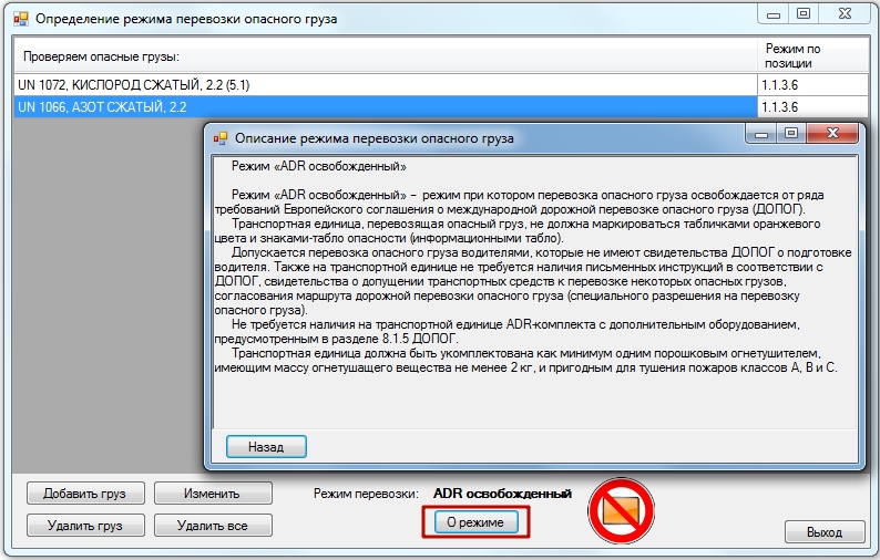 Если при перевозке опасного груза в режиме «ADR-освобожденный» ДОПОГ / ADR требует соблюдения каких?либо специальных требований, то программа также покажет это том же информационном окне.