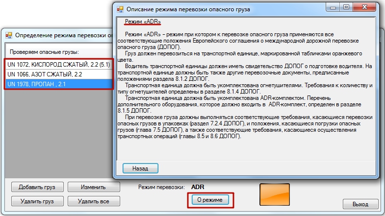 Режим перевозки выбранных опасных грузов отображается в информационном поле, расположенном в нижней части окна. Также в этом поле расположена кнопка «О режиме», нажав на которую вы можете ознакомиться с общей информацией о требованиях ДОПОГ/ADR, которые должны выполняться при перевозке выбранных опасных грузов и тех требованиях, которые выполнять не требуется.