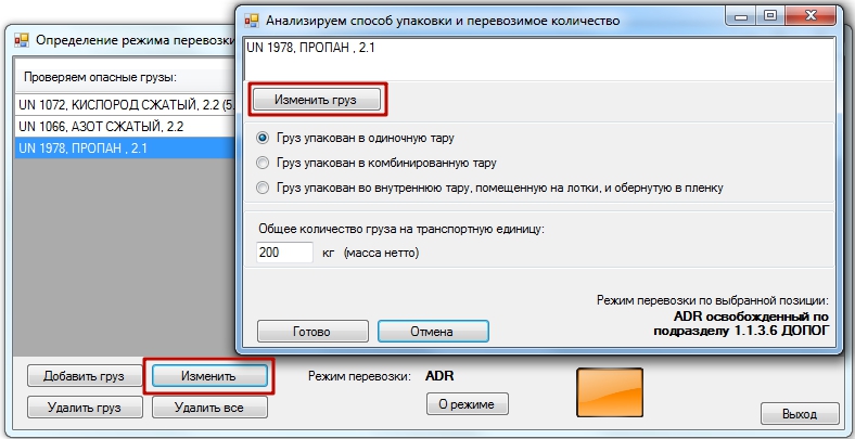 После выбора количества опасного груза в нижней части диалогового окна Программа отображает режим его перевозки.