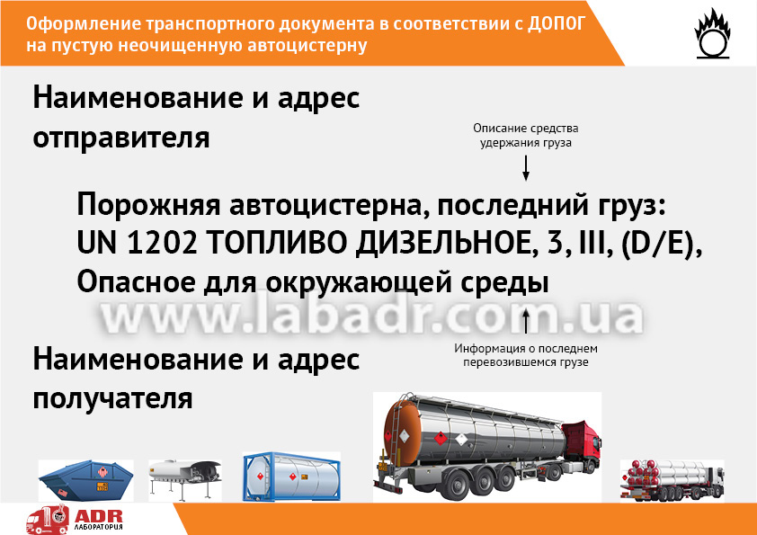 Здравствуйте,интересует вопрос по поводу перевозки ДП (UN1202) в цистернах,после разгрузки тару не очищают,могли бы Вы привести пример документа и как его заполнять для пустой неочищенной цистерны. Буду очень благодарен