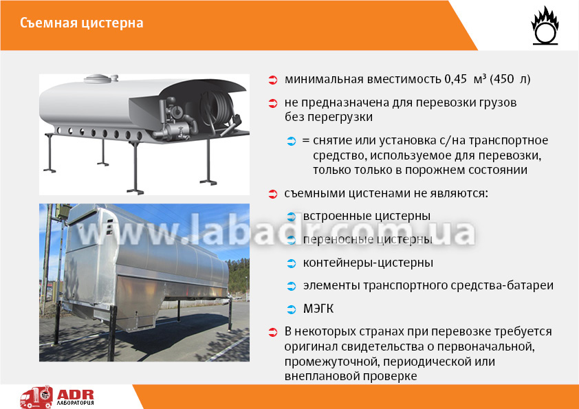 В соответствии с разделом 1.2.1 ДОПОГ съемная цистерна — цистерна, за исключением встроенной цистерны, переносной цистерны, контейнера-цистерны или элемента транспортного средства-батареи или МЭГК, которая имеет вместимость более 450 литров, не предназначена для перевозки грузов без перегрузки и обычно подлежит обработке только в порожнем состоянии.