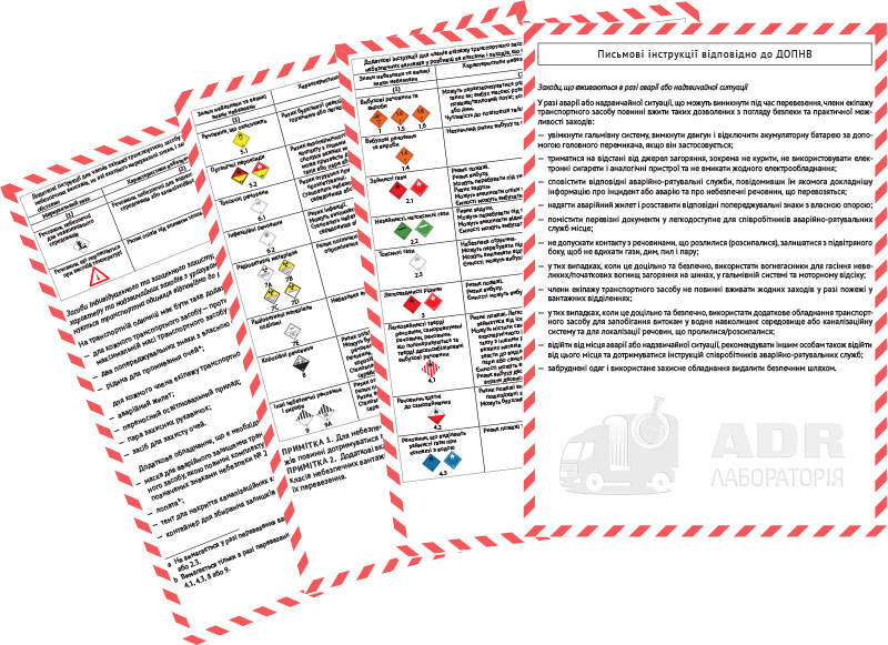 Письмові інструкції складено українською мовою, відповідають вимогам ДОПНВ 2025 року (ADR 2025) й можуть застосовуватися під час перевезення будь-якого небезпечного вантажу.